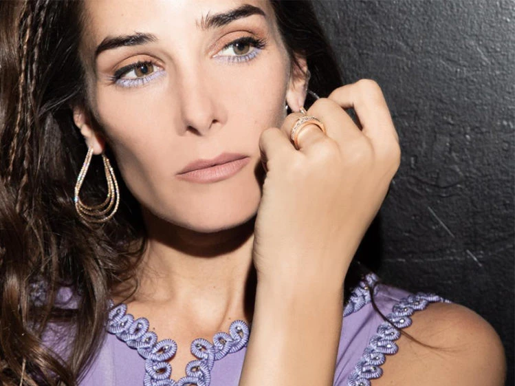 Completó el look con dos pares de argollas doble zig zag, uno en oro blanco con brillantes y el otro en oro amarillo; pulseras tenis con brillantes una en oro blanco, oro amarillo y oro rosa; dos Anillos de oro rosa y brillantes; y dos anillos de oro amarillo y brillantes.