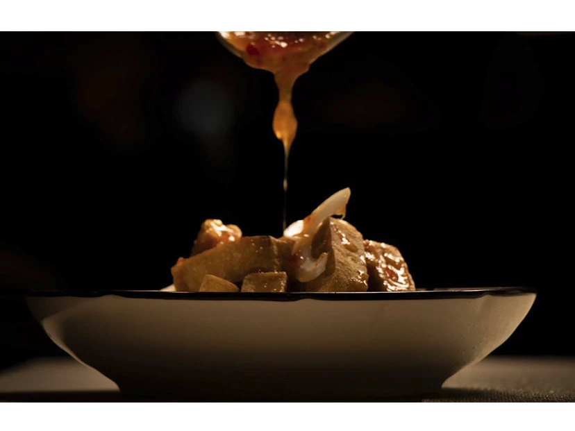 Paso 2: Cortar el tofu en cubos, condimentar con las especias, salar y luego rebozar con almidón de maíz.
