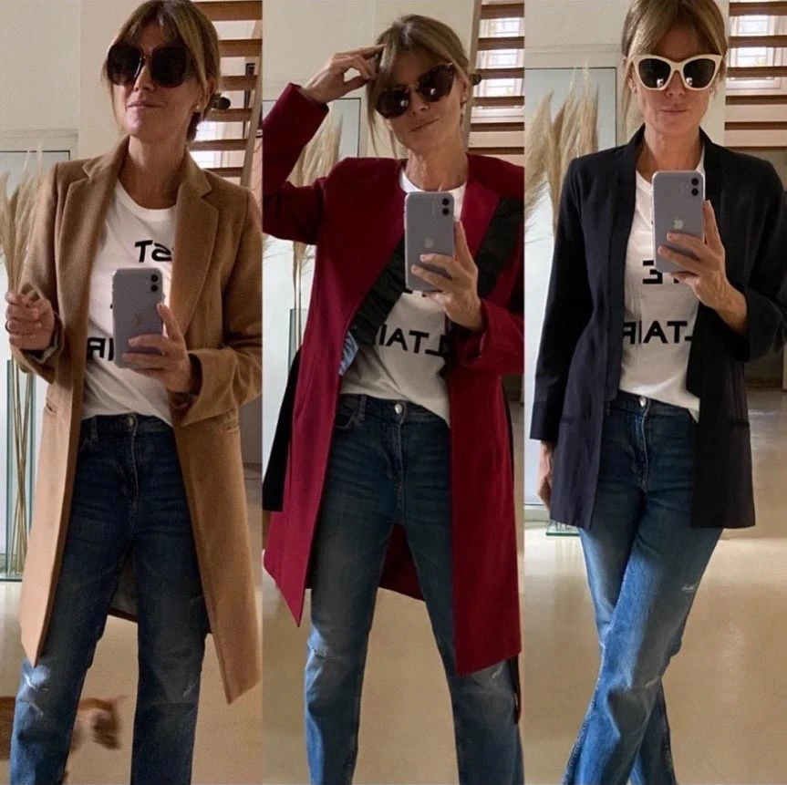 "Fondo de armario. Otoño ? cual elegís ?", posteó Flavia Palmiero en su cuenta de Instagram y subió tres fotos en remera, jean y tres sacos diferentes.