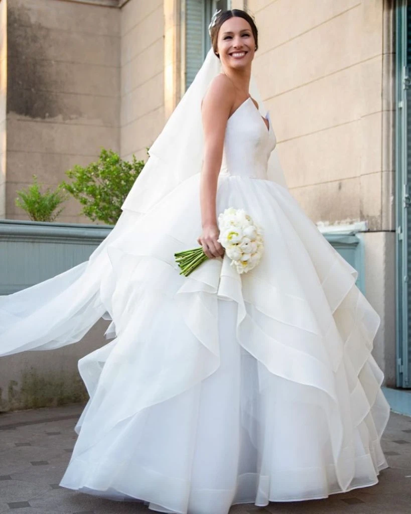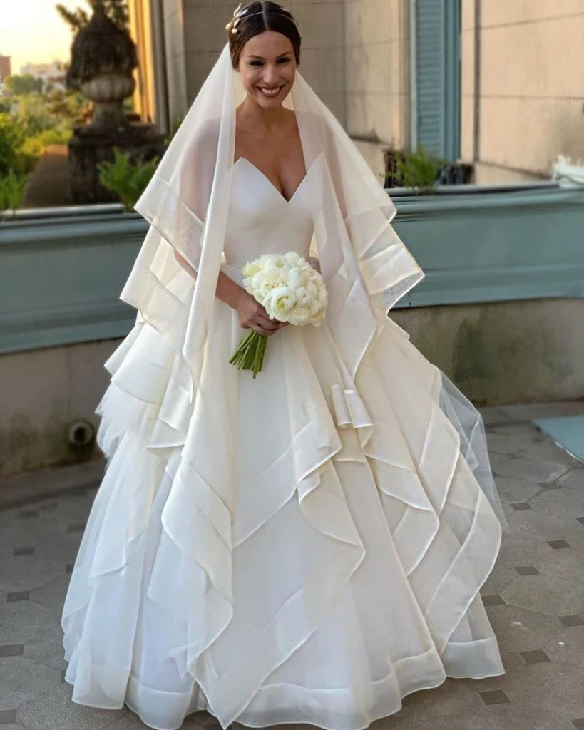 El vestido de Pampita era un traje de novia de cuerpo estructurado con sugestivo pero delicado escote V, en tono blanco almendra, con falda en cascada, romántica y femenina.