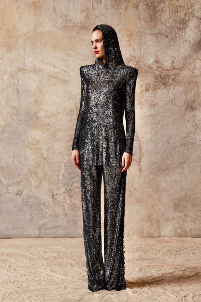 Esta colección estuvo cargada de piezas elásticas de lentejuelas; entre los vestidos, que venían en varios largos, había camisas, un top con capucha y calzas, que se podían usar juntos o mezclar con un guardarropa existente.