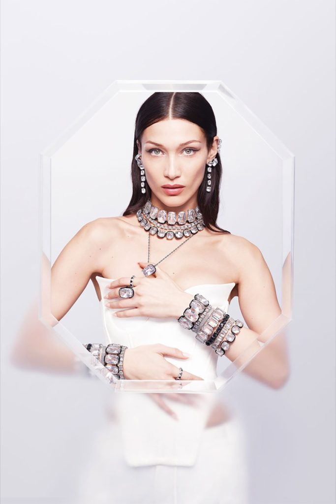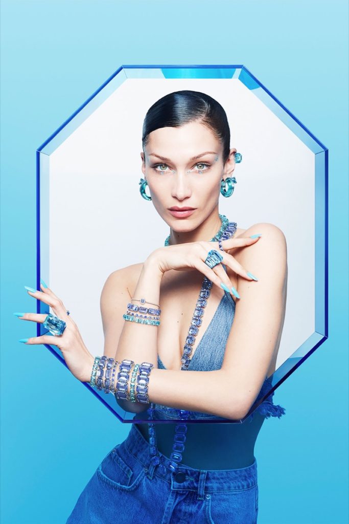 Bella Hadid es la nueva cara elegida por Swarovski para mostrar su nueva campaña de joyas súper coloridas.