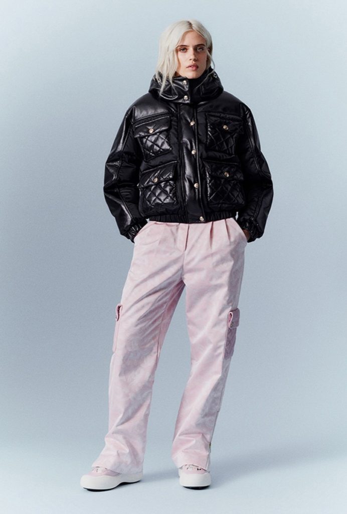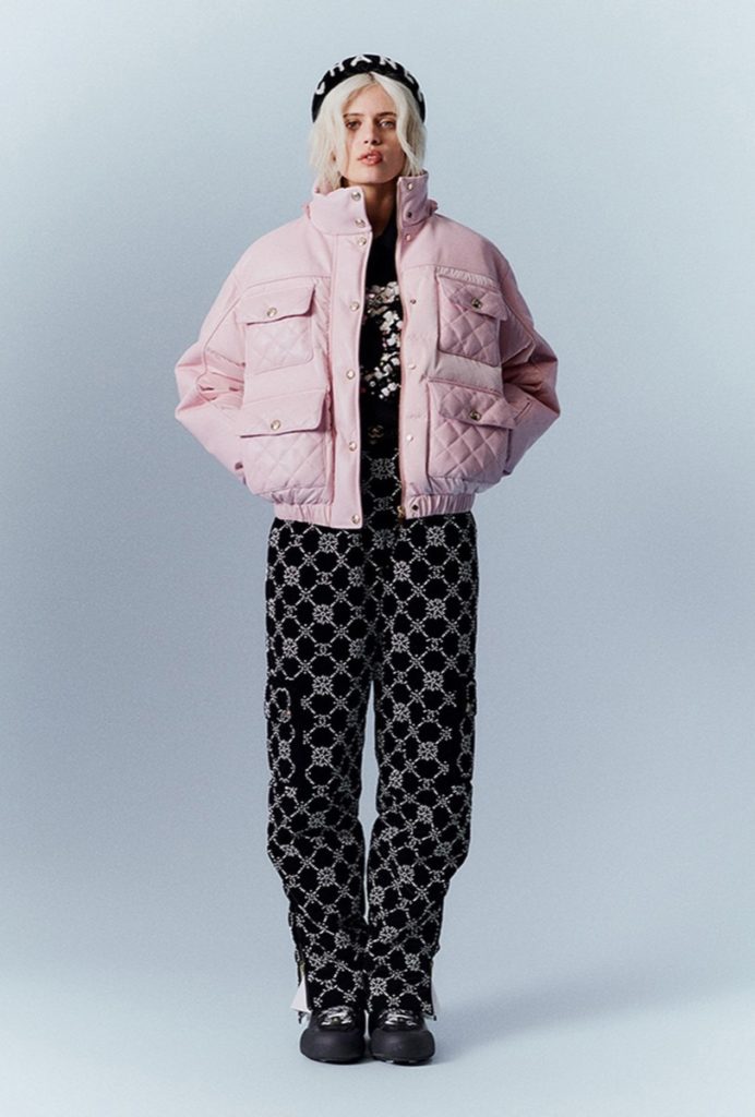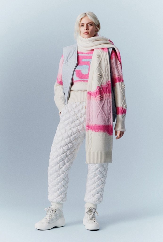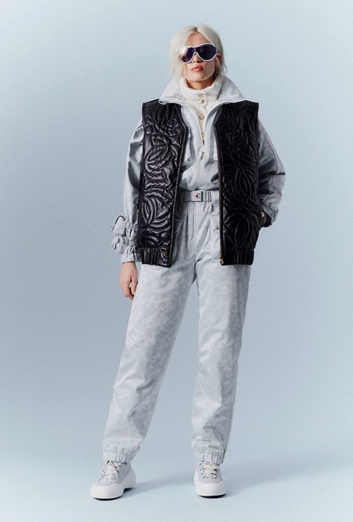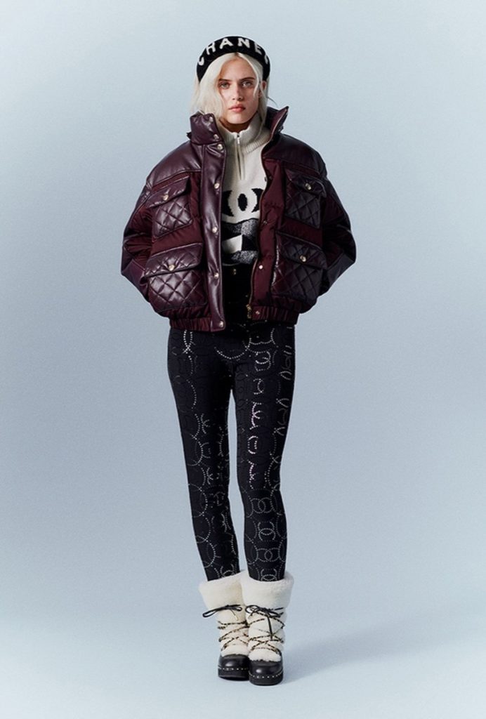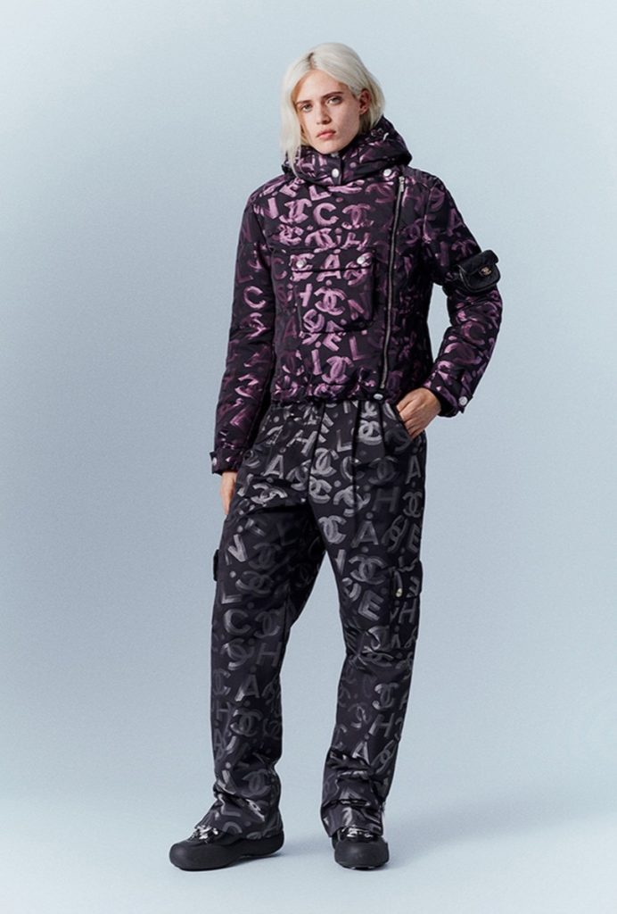 La colección consta de conjuntos de ropa de invierno muy abrigadas: chalecos y trajes de esquí, overoles, suéteres y chaquetas de plumón estampadas con los logotipos de Chanel.