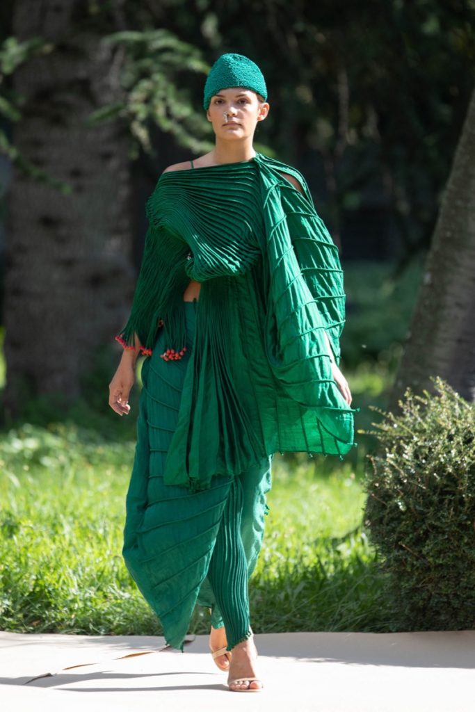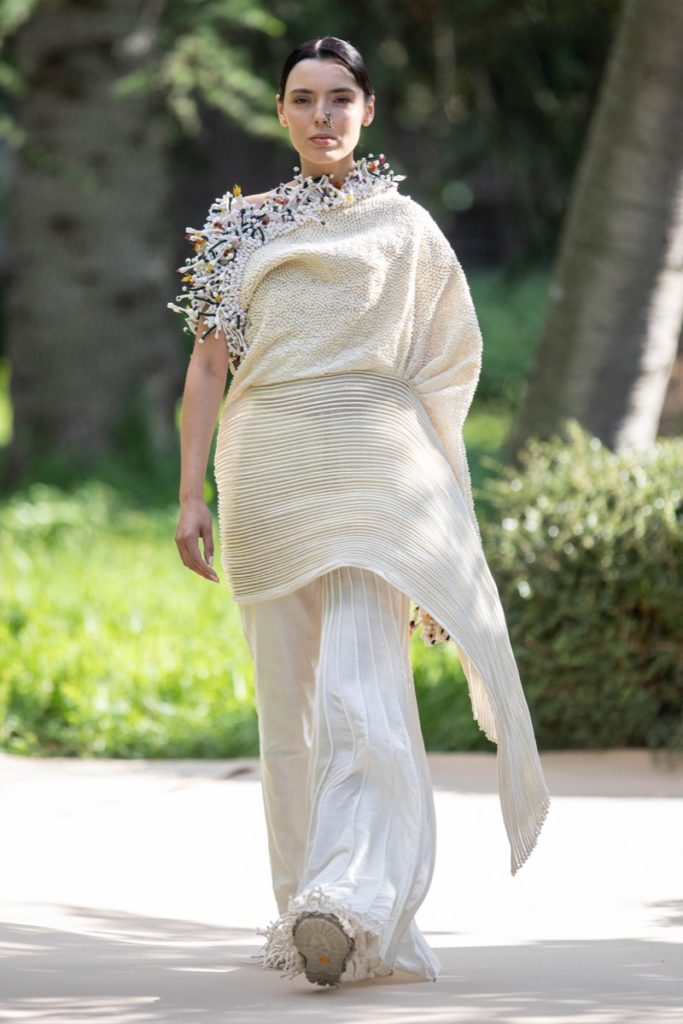 La colección de alta costura de Vaishali presentó 20 prendas, con artesanía de toda la India, incluida la lana merina tejida en Maheshwar, Khun de Karnataka y otros tejidos indígenas de Bengala Occidental.