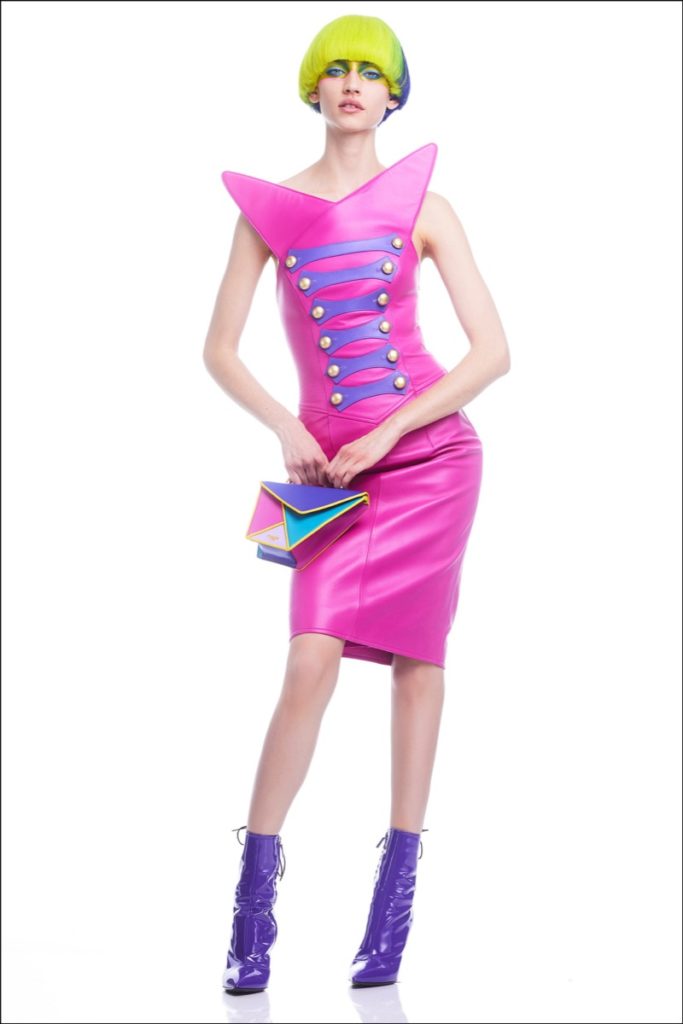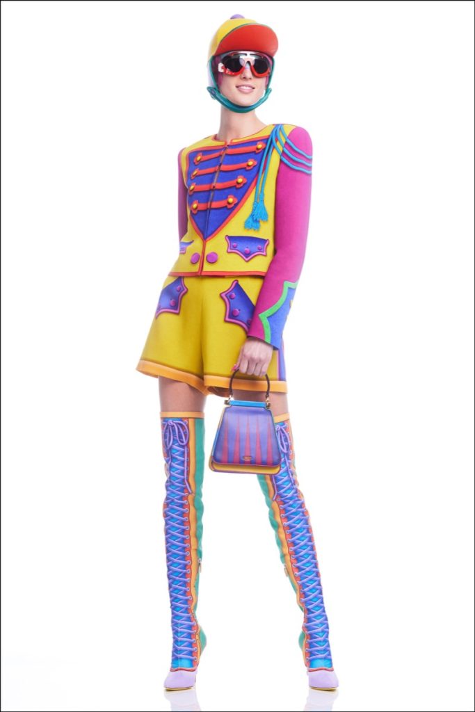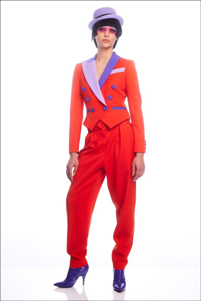 “El colorblocking es un Moschino, la broma que hizo Franco… Quería tomar códigos militares y cosas formales y formales, pero hagámoslos en colores dulces y hagámoslos más divertidos y surrealistas”, dijo Scott.