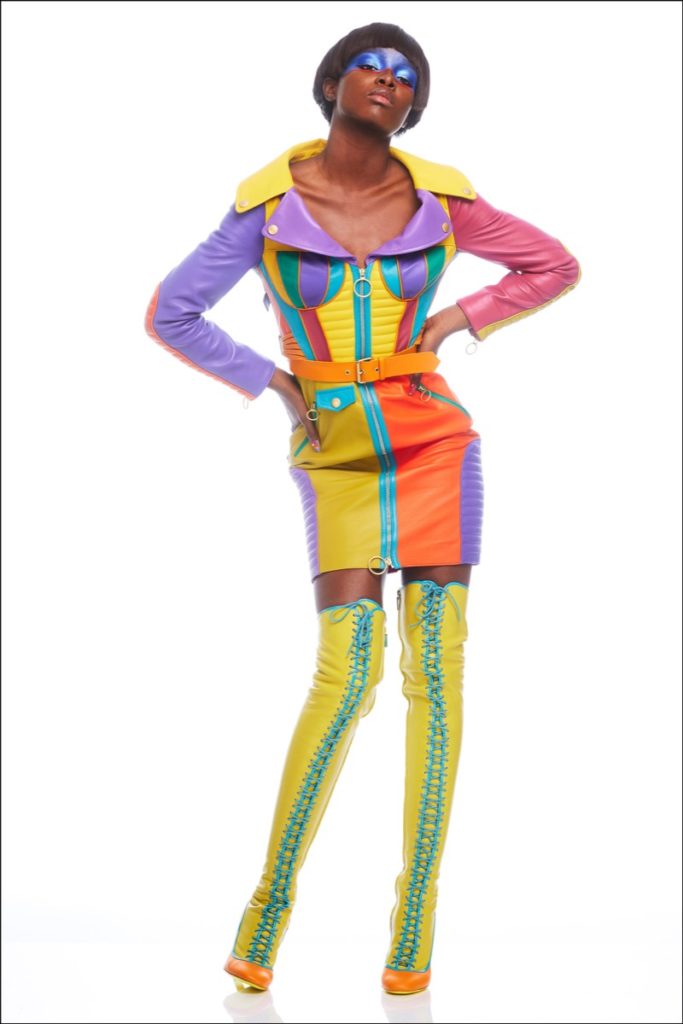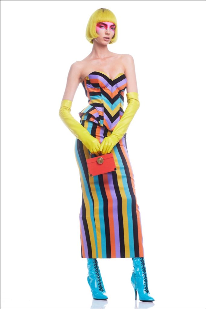 Los patrones de alta costura se disuelven en braguitas trompe-l'oeil, incluido un vestido escotado con cuello anatómico, botones, pliegues y bloques de color en el busto que recuerdan al diseñador de los años 60 y de Los Ángeles Rudi Gernreich.
