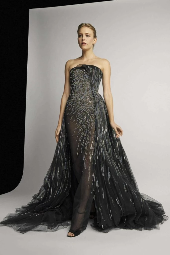 Vestido negro sin mangas con escote en V profundo con una falda voluminosa en tul de seda. Foto: Fotonoticias