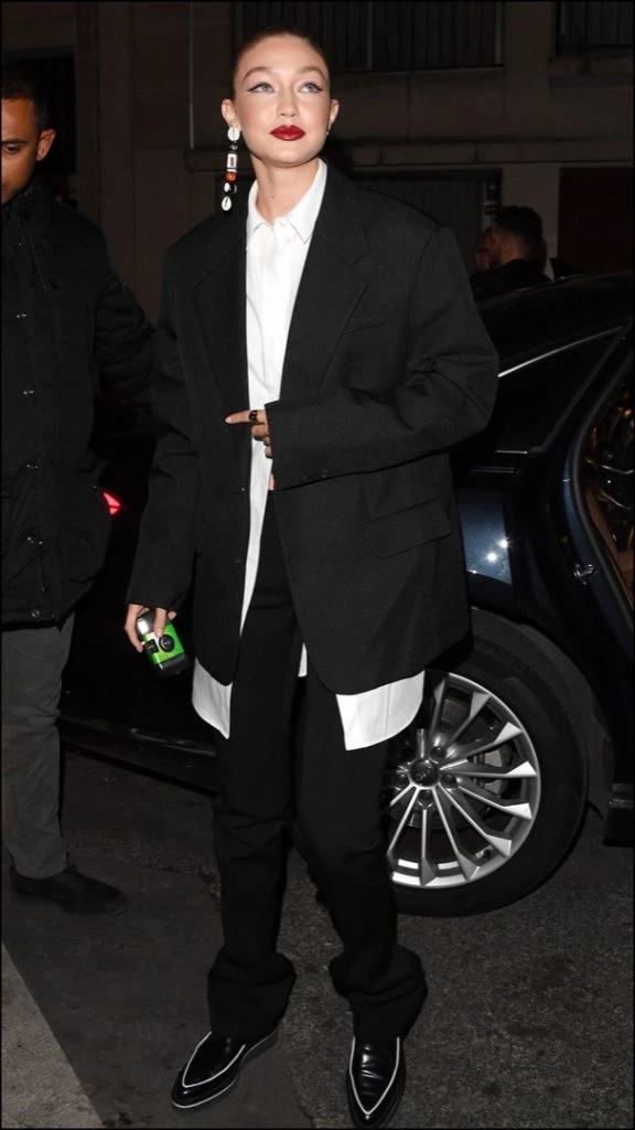 Total look black + campera o camisa oversize con estampa. Para cortar el monocolor, Gigi Hadid sumó a su estilismo una prenda con estampa.
