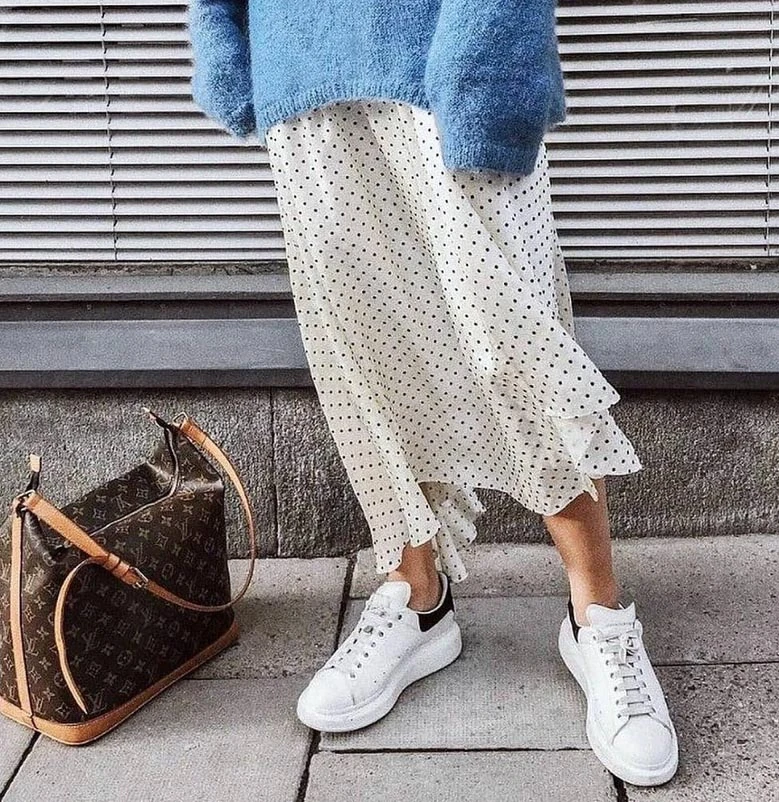 Sneakers, ugly de doble suela y colores llamativos, blancos impolutas… El tipo de zapatilla que se te ocurra puede ir con el vestido más romántico que tengas en tu placard.