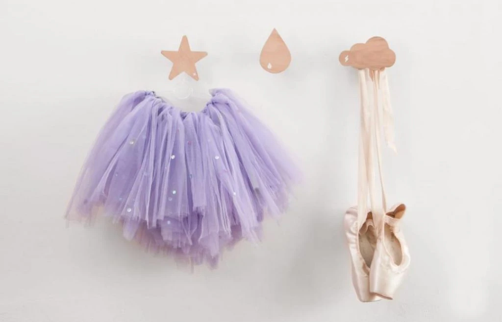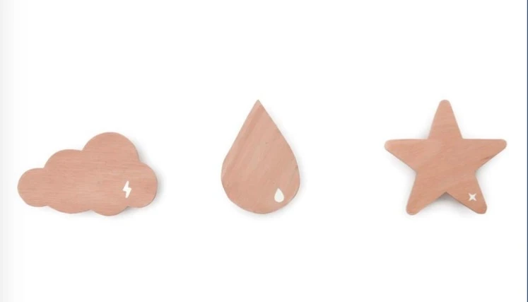 Cada perchero está realizado a mano en madera de eucalipto. La Estrella mide 9,5 x 10 cm, la Nube 12 x 7.5 cm y la Gota 7 x 10 cm.