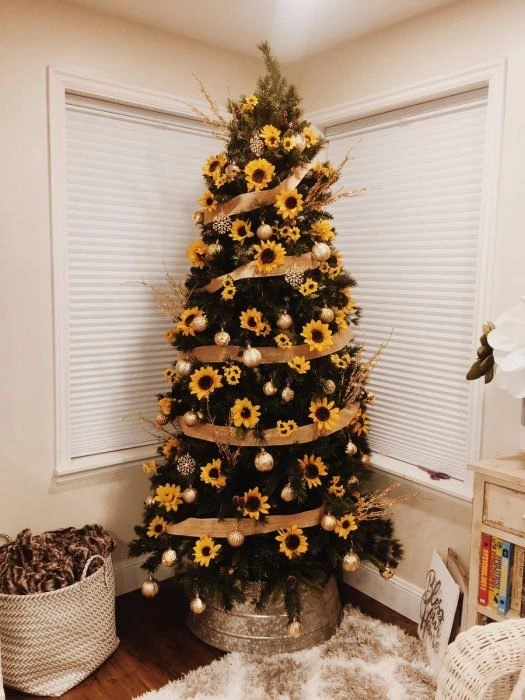 El árbol de Navidad de girasoles es una nueva tendencia. Te puede gustar o no… pero vale la pena mirarlo, cambiarlo por otra flor… ¡lo que sea! Y poner manos a la obra.