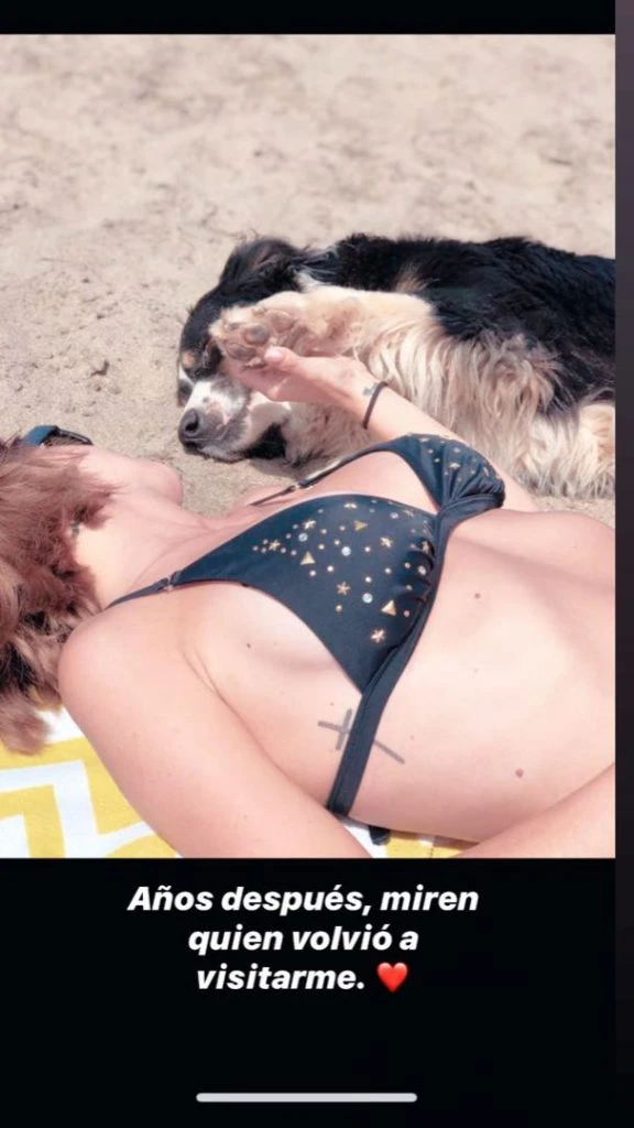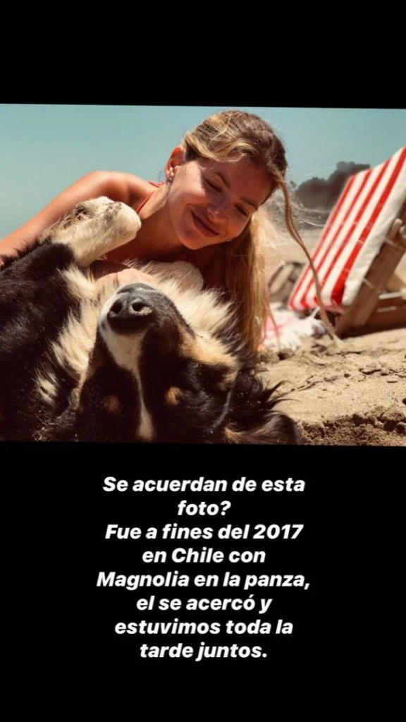 En uno de los postes muestra fotos embarazada de Magnolia en la playa junto a un perro. Y repite la imagen ahora. "¿Se acuerdan de esta foto? Fue a fines del 2017 con Magnolia en la panza, él se acercó y estuvimos toda la tarde juntos", escribió. Y sobre la foto actual, puso: "Años después, miren quién volvió a visitarme".