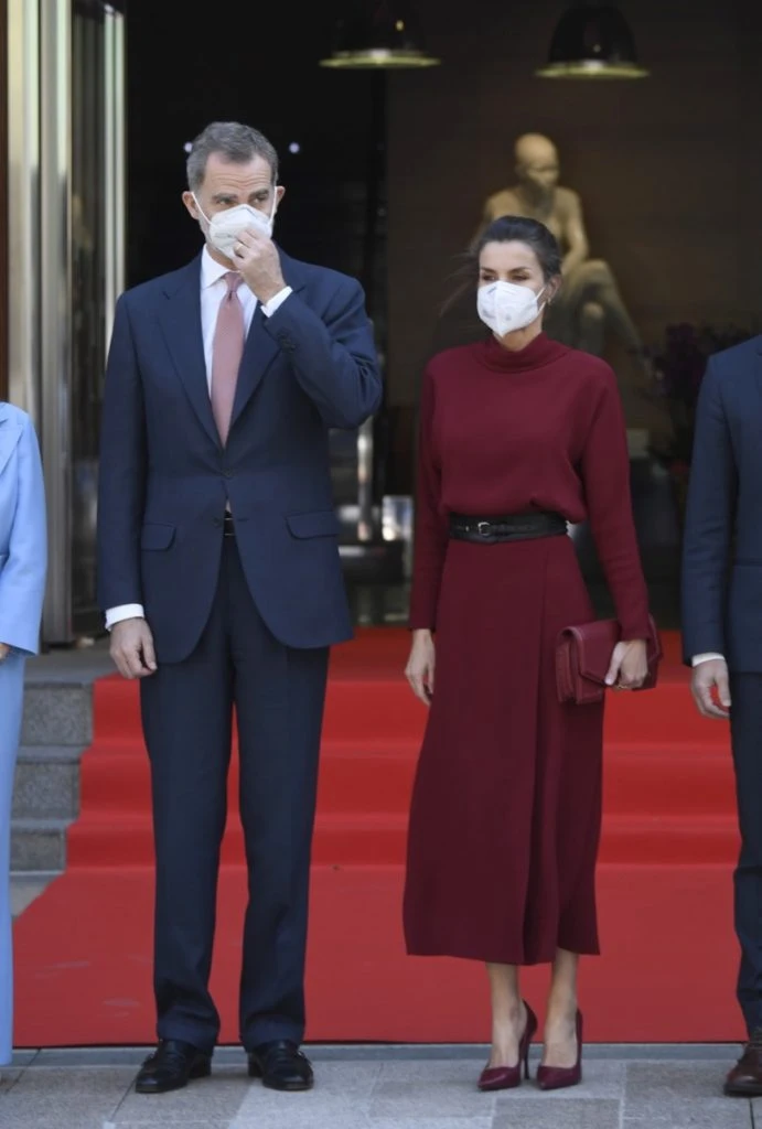 El primer look de Letizia para visitar a la Casa de la Vall y al Comú, consistió en un vestido de color bordó de Massimo Dutti que acompañó estrategicamente con un cinturón de cuero que potenciaba su cintura.