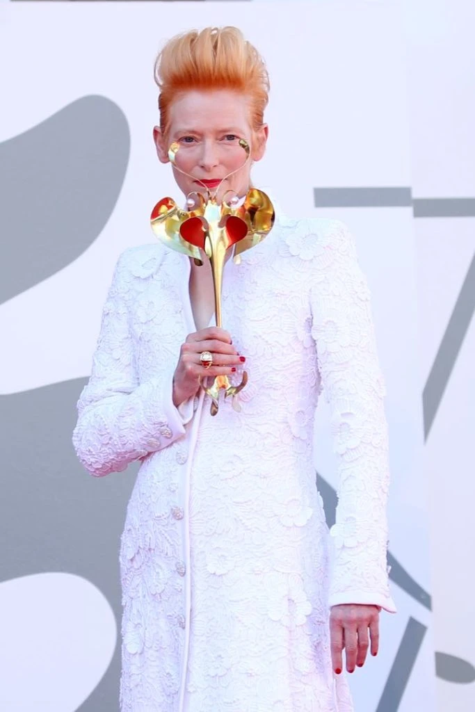 Hubo pocas celebrities y Tilda Switon se destacó en la ceremonia de apertura del 77 ° Festival Internacional de Cine de Venecia con sus dos looks y un accesorio muy original.