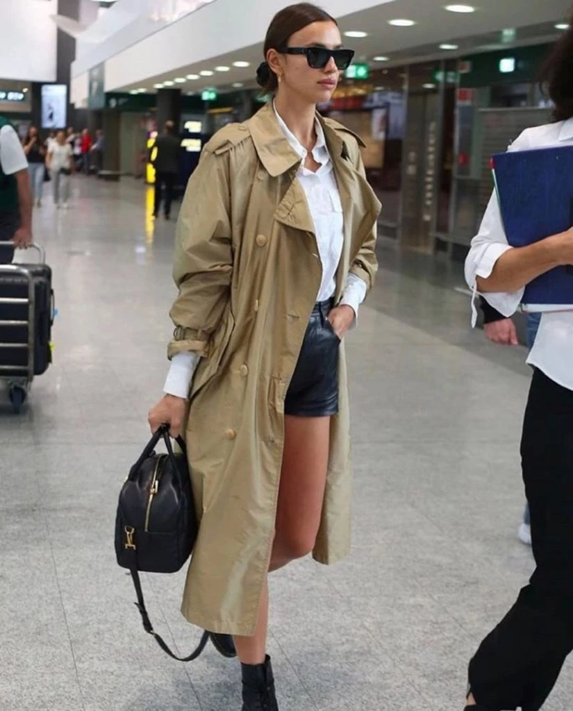 Irina llevó una camisa blanca, un short de cuero, botinetas negras y el infaltable trench que le da ese toque canchero a este look. Un estilismo fácil de copiar (si querés podés cambiar el short por pantalones engomados, otro ítem muy de tendencia esta temporada).