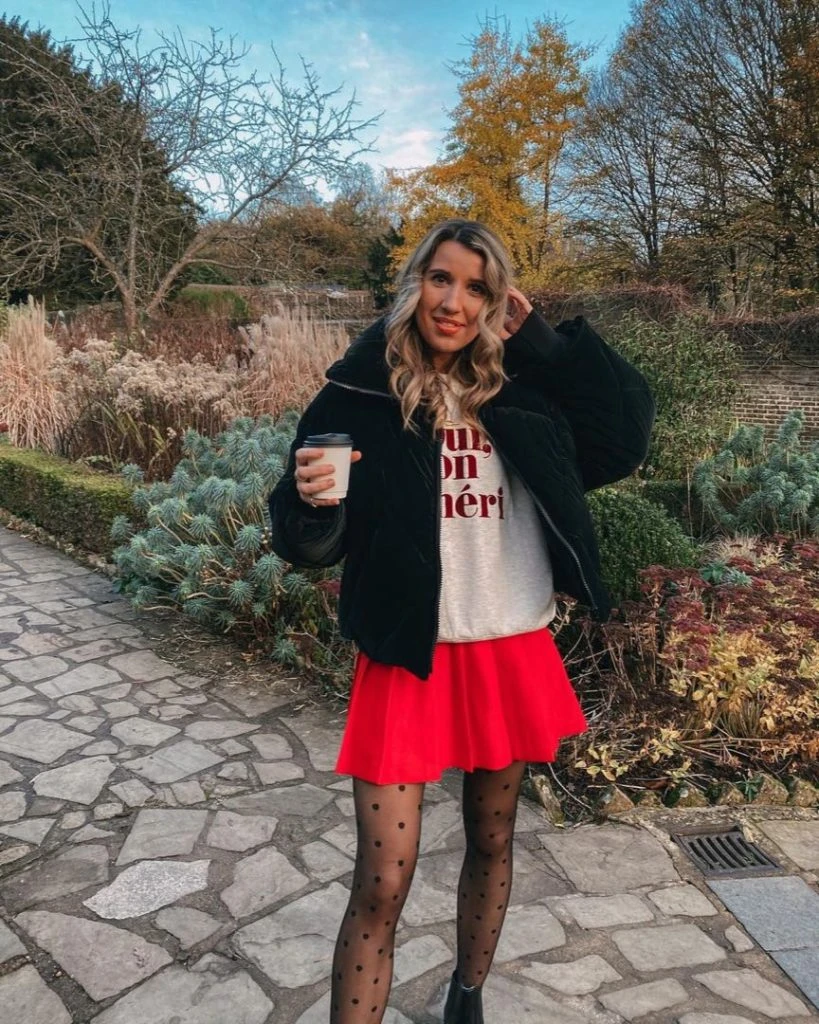 También son ideales para complementar este look de mini falda roja, buzo estampado y campera matelasseada. Las botinetas de cuero negro junto con las medias negras de plumetí le aportan glamour a un look que, de otro modo, sería más informal.