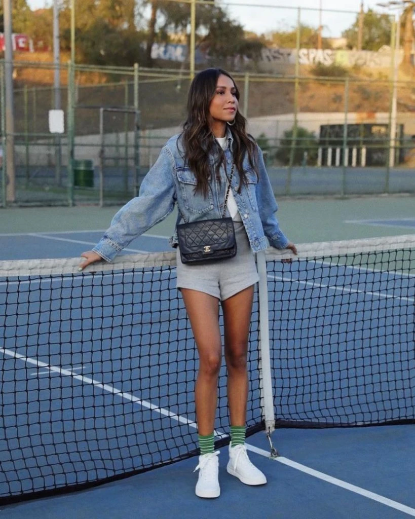 Con short engomado, suéter y saco XL, en un outfit en el que predominan el negro y el gris, las medias largas estampadas son el complemento ideal.