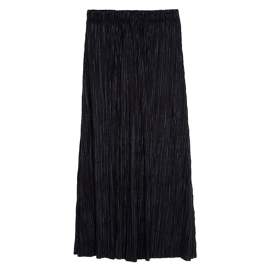 Se trata de un outfit negro de pies a cabeza con inspiración boho y muy del estilo de Chiuri. Una falda plisada hasta el piso y bien vaporosa. Un crop top negro y la chaqueta de cuero, un básico de media estación.