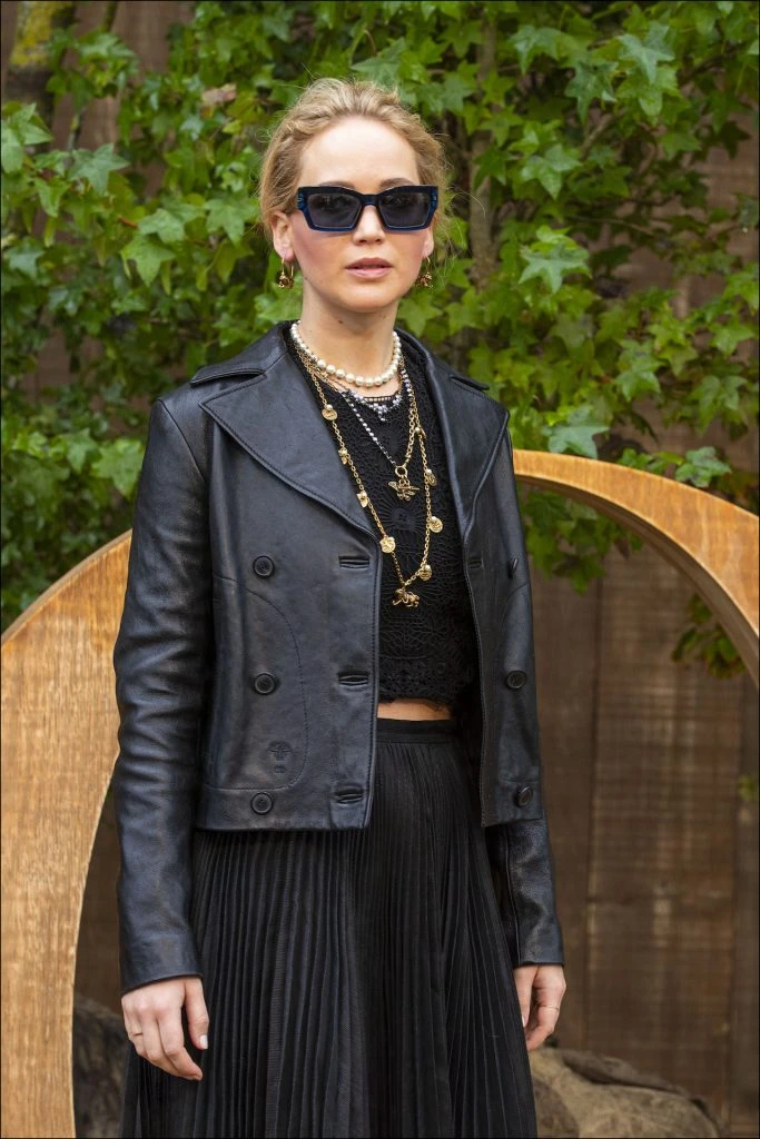 Los accesorios juegan un rol fundamental en este estilismo. Jennifer Lawrence llevó un collar Teddy-D de Dior, un choker de perlas y unos anteojos oscuros. En sus orejas lució argollas medianas con dijes.