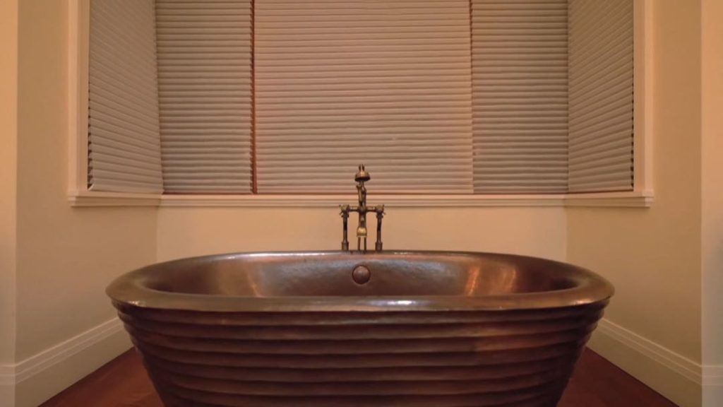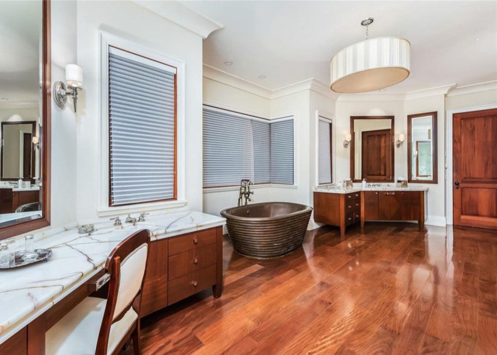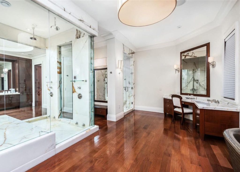 El baño posee una amplia ducha de vapor de ónix y vidrio, un gran vestidor y una bañera de hidromasaje personalizada.