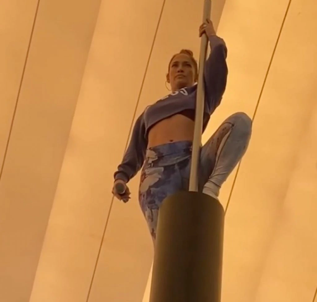 Vestida con sus calzas y un simple buzo, JLo lideró cada ensayo. Se la vio trepar, saltar y bailar al ritmo de la música entre decenas de jóvenes bailarines y sin perder el aliento.