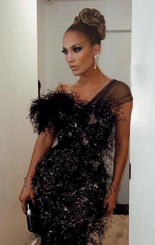 El vestido negro llevaba un solo hombro, bordados dorados y plumas, el ítem de moda del momento. El diseño era asimétrico y drapeado en la cintura. La artista le sumó aros de diamantes, sandalias negros con plataforma y tacos de 15 cm (de Jimmy Choo) y llevó el pelo con un recogido años setenta.