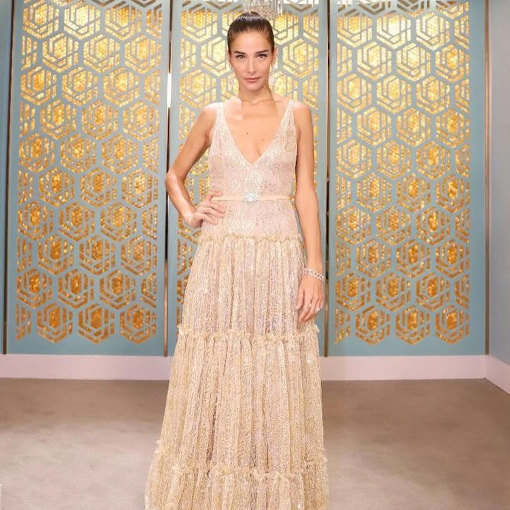 Con mucho glamour y sofisticación llevó un vestido de encaje dorado con escote en V profundo. El diseño es de corte bajo bien al cuerpo hasta la cadera y de ahí sale la falda con gran amplitud hacia el final con fruncido hecho artesanalmente.