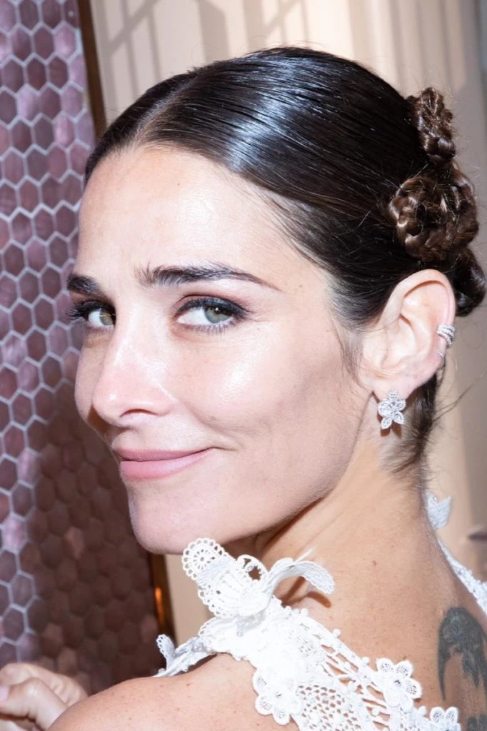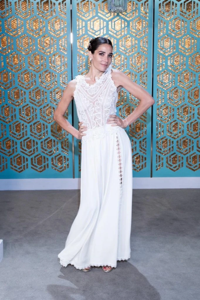 Acompañó con joyas de oro blanco y brillantes creadas por la diseñadora Flo Boskis. Para el beauty look eligió llevar el pelo recogido con cuatro trenzas simulando un tocado y el make up fue creado en tonos marrones y cobres con la piel bien hidratada y labios nude.