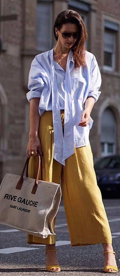 El street style la incorporó a sus looks y la combinó con colores ocres y marrones. Pero esta camisa también queda muy bien con jeans o pantalones blancos.