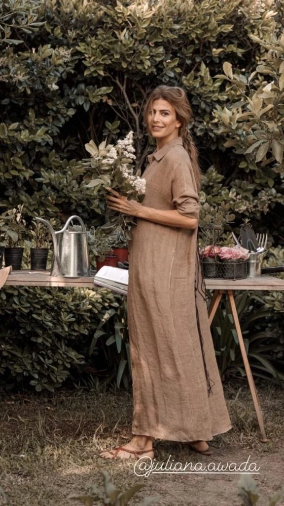 Para su look, Juliana eligió un vestido camisero largo a los tobillos de 100 % lino natural y está teñido en colores terrosos, uno de los tonos estrella de esta temporada.