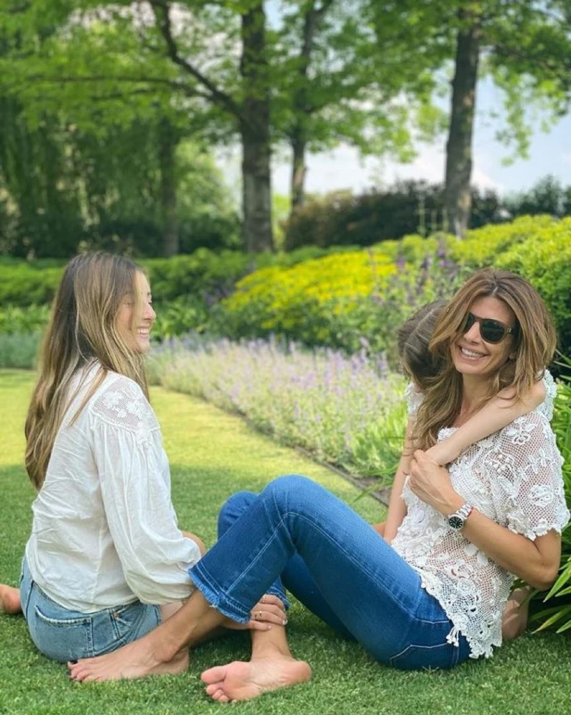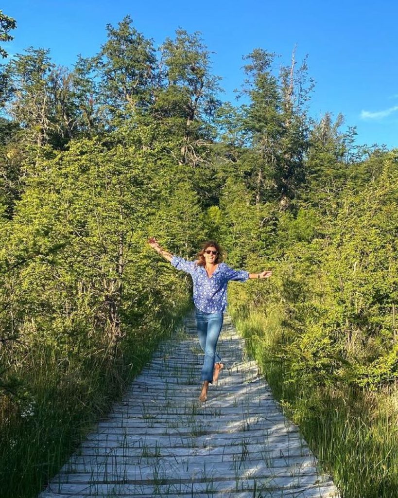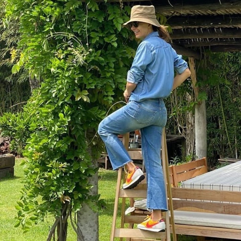 Desde Villa La Angostura, donde está pasando las vacaciones en familia, Juliana Awada comparte fotos de sus looks. Esta vez se mostró con una camisa estampada en color celeste y un jeans muy de tendencia: un cropped flare.