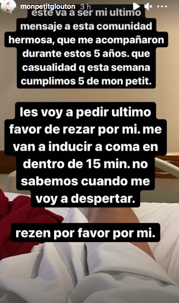 Karina, de origen asiático, está embarazada de 5 meses y en la mañana de hoy escribió un mensaje en sus redes sociales avisando que, al presentar neumonía bilateral, iba a ser inducida a un coma farmacológico para una mejor atención de su caso.