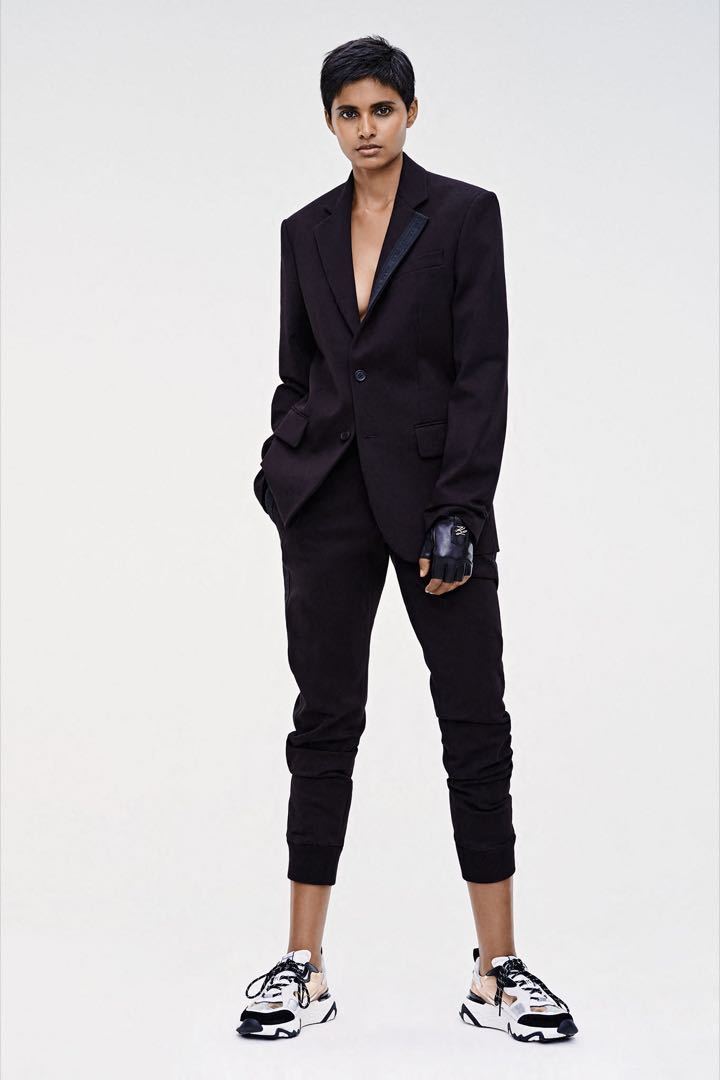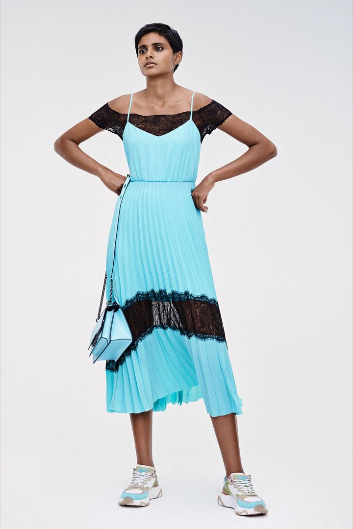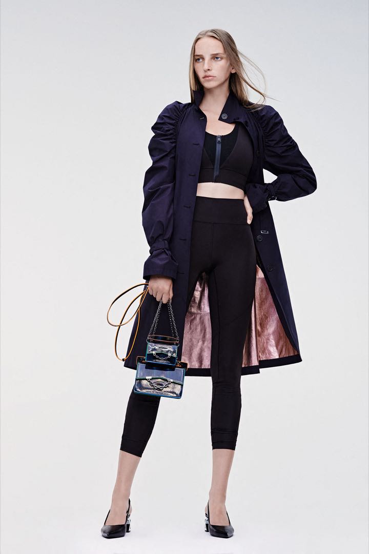 La camisa blanca fetiche de Lagerfeld regresa como un vestido camisero con hombros descubiertos. La estética futurista está presente en los logotipos hinchados en plástico iridiscente y una gabardina plateada.