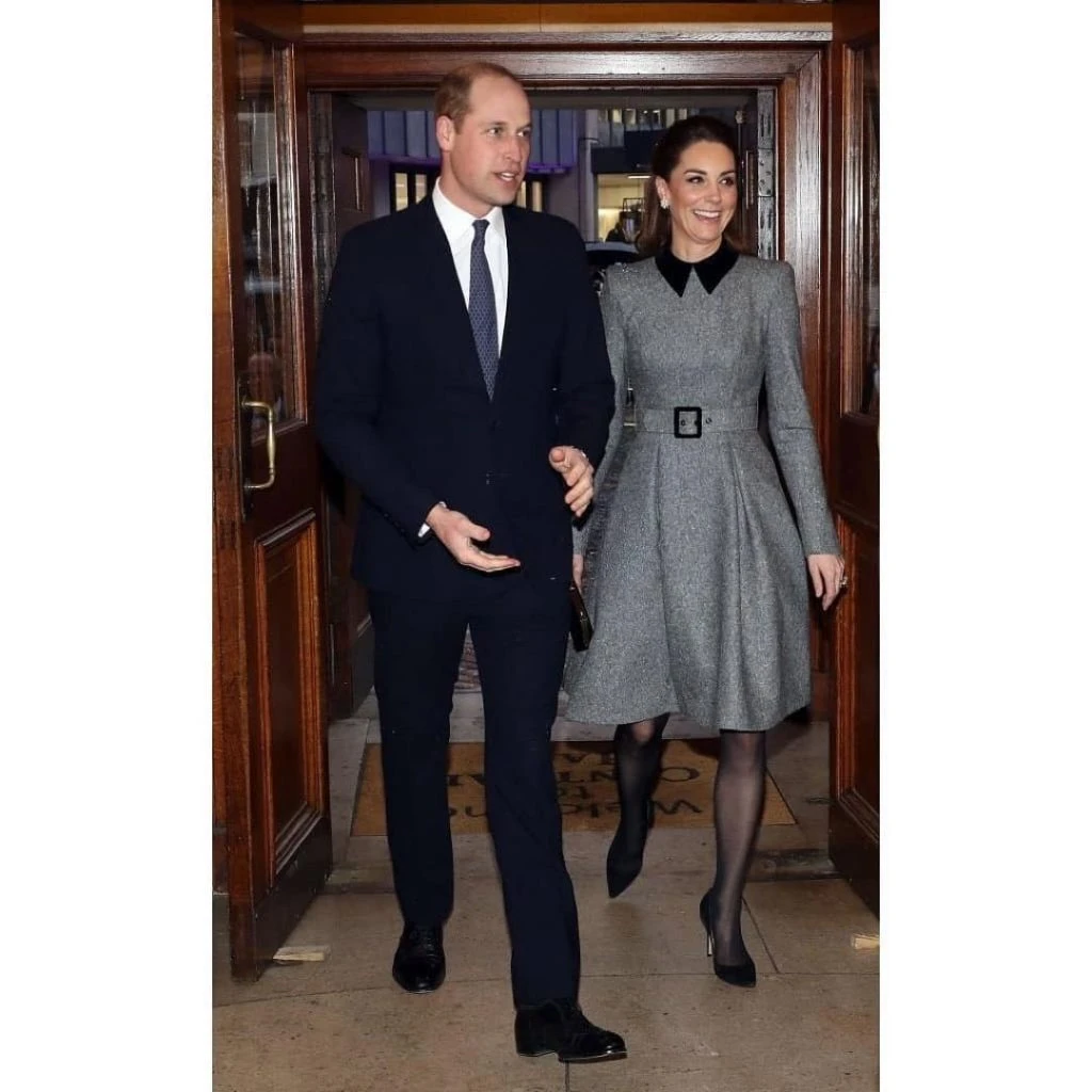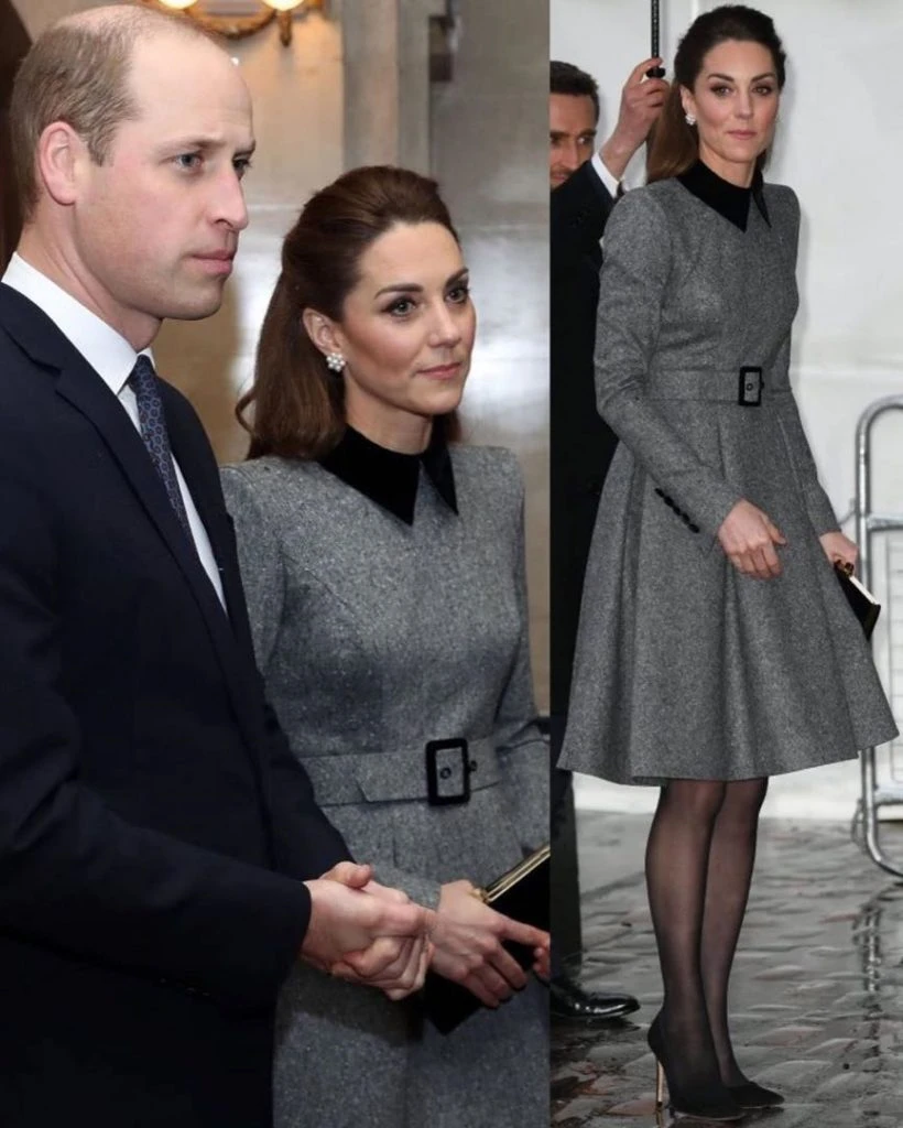 El vestido que eligió Kate en color gris, era de largo por encima de la rodilla, llevaba cinturón, cuello bebé en terciopelo negro, y botones negros en los mangas. Le sumó al look medias negras, aros de perlas y un clutch de color negro.