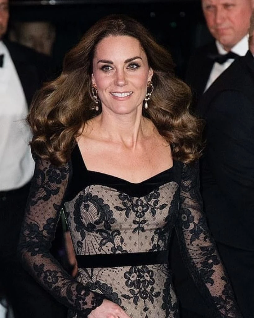 Kate se destacó con un vestido de Alexander McQueen de encaje negro, terciopelo y fondo color piel que causaba el efecto de un naked (desnudo) dress. Con cintura ajustada y espalda escotada fue un diseño creado exclusivamente para ella.