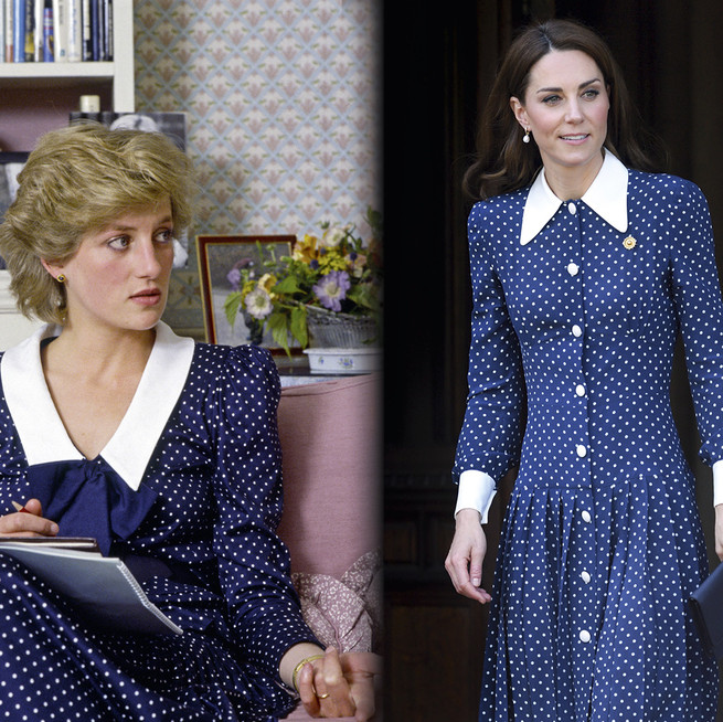 La elección del estilismo de la duquesa ha recordado una vez más a Diana de Gales. La madre del príncipe Guillermo lo lució en infinidad de ocasiones, desde el día que presentó al mundo a su primer hijo en las puertas del hospital St. Mary con vestido verde de lunares blancos, al rosa que llevó Diana en un tour por Italia a mediados de los 80 o al azul marino con lunares y cuello blanco con el que se fotografió en Kensington Palace en 1985. Los tres parecen haber sido inspiraciones para otros trajes escogidos por la propia Kate.
