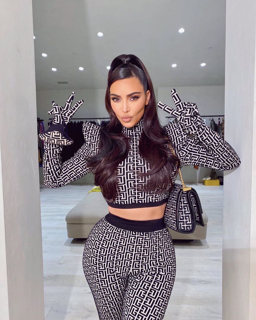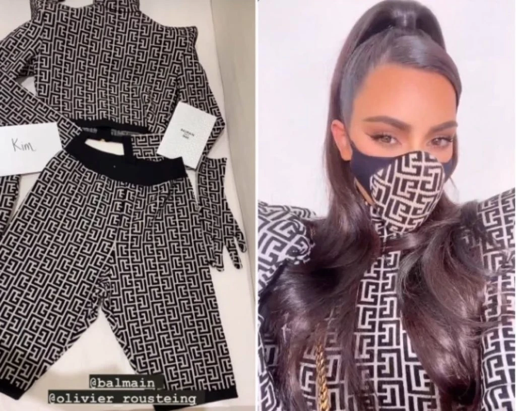 Kim posteó en todas sus redes las fotos con este look con un exclusivo outfit muy al estilo Kardashian. Este estilismo llevó estampado el logo típico que lleva Pierre Balmain.