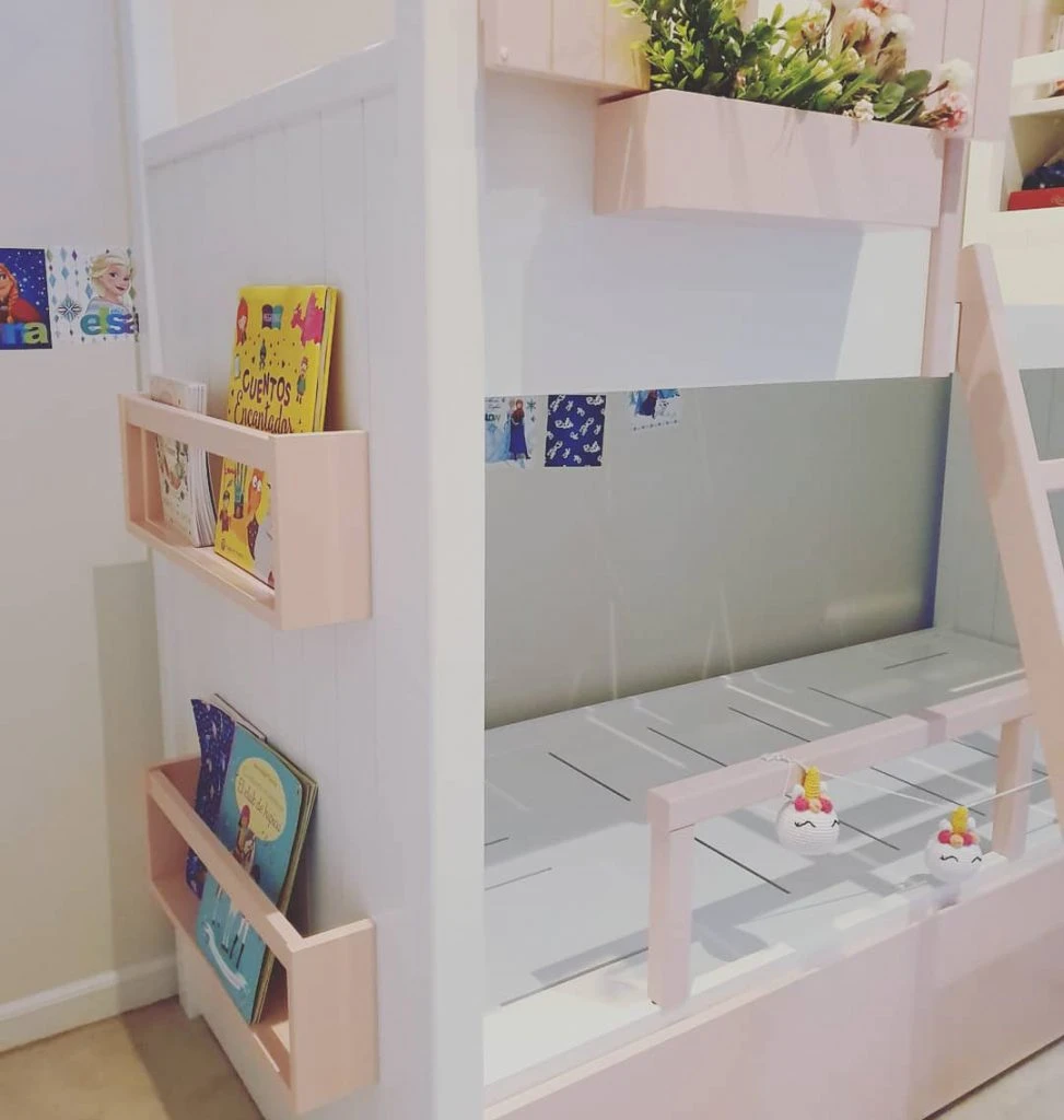 En el caso de la casita para Rufina, la China pidió que la escalera sea frontal. En el ambiente que se crea arriba, hay una repisa para guardar pijama, libros, juguetes o lo que a los chicos se le ocurra. También trae estantes laterales y una divinas ventanitas decoradas con maceteros y flores artificiales.
