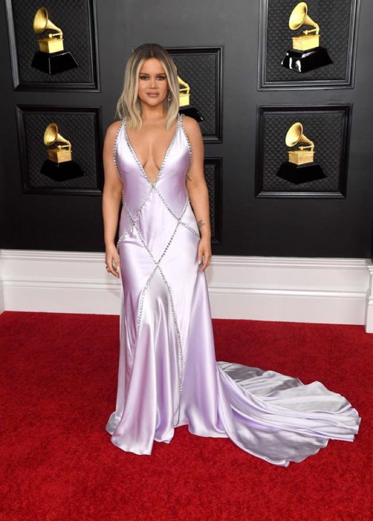 Maren se puso un vestido de seda color lila de Dolce & Gabbana con aplicaciones de piedras en abdomen y breteles. El vestido ceñido llevaba cola dándole un aire glam.