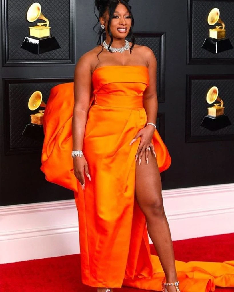 Megan Thee Stallion usó un vestido naranja brillante de Dolce & Gabanna. El diseño tenía una abertura a la altura de la cadera del lado izquierdo.