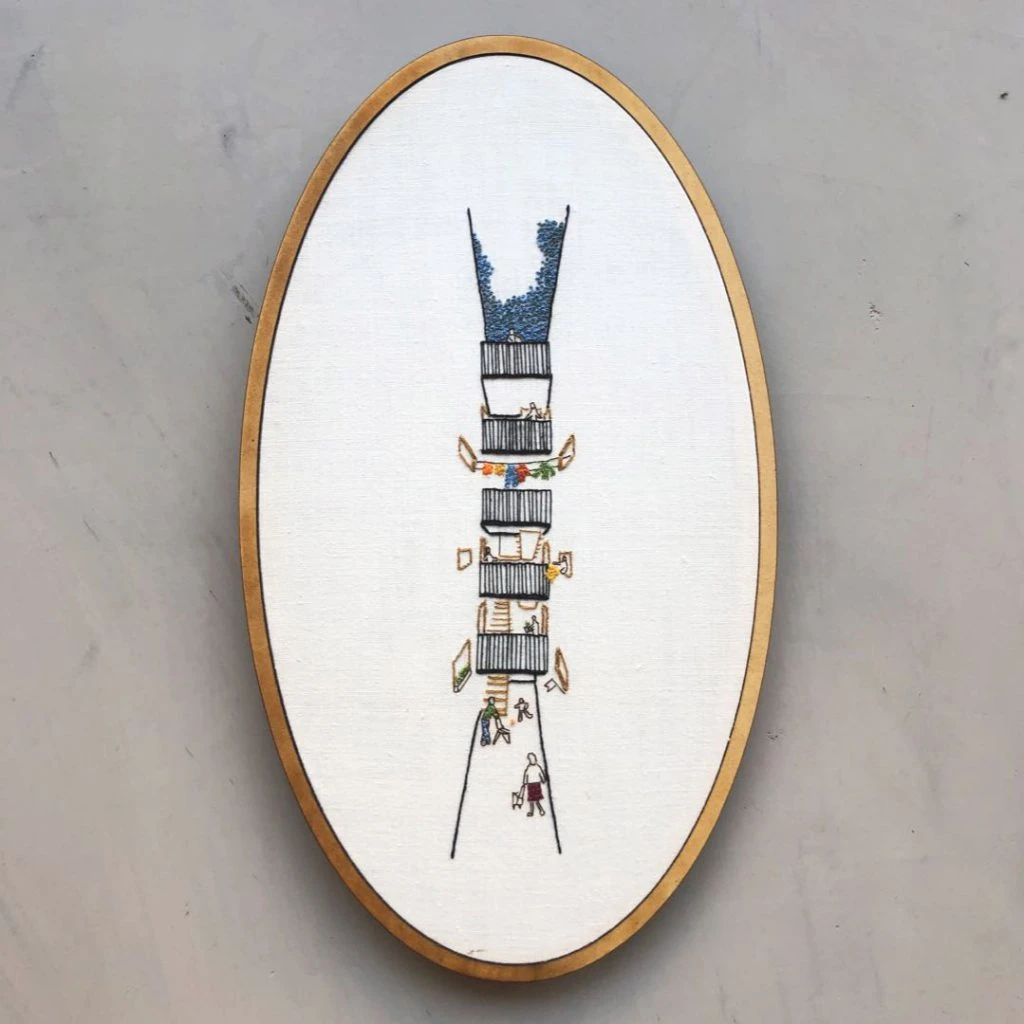 Según cuenta Luciana Teper, el proceso de bordar arquitectura demanda mucho tiempo. Con dedicación casi exclusiva, una obra completa puede llevarle unas 3 semanas de trabajo. “Mis bordados tienen puntos más lineales que de superficie. Son puntadas que me permiten plasmar formas pero también reflejan la materialidad de un edificio”, explica.