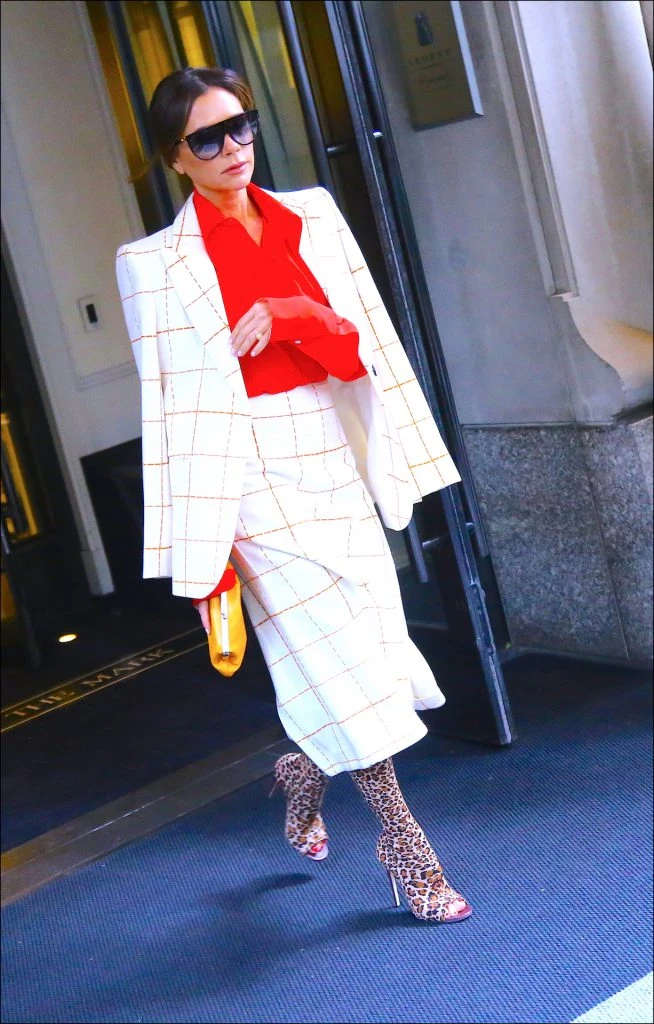 La esposa de David Beckham se pone las prendas de su marca tal cual están combinadas en el look book o repite los equipos que se armaron para el desfile. Esta vez apostó por un saco entallado y una pollera midi con una tabla frontal.