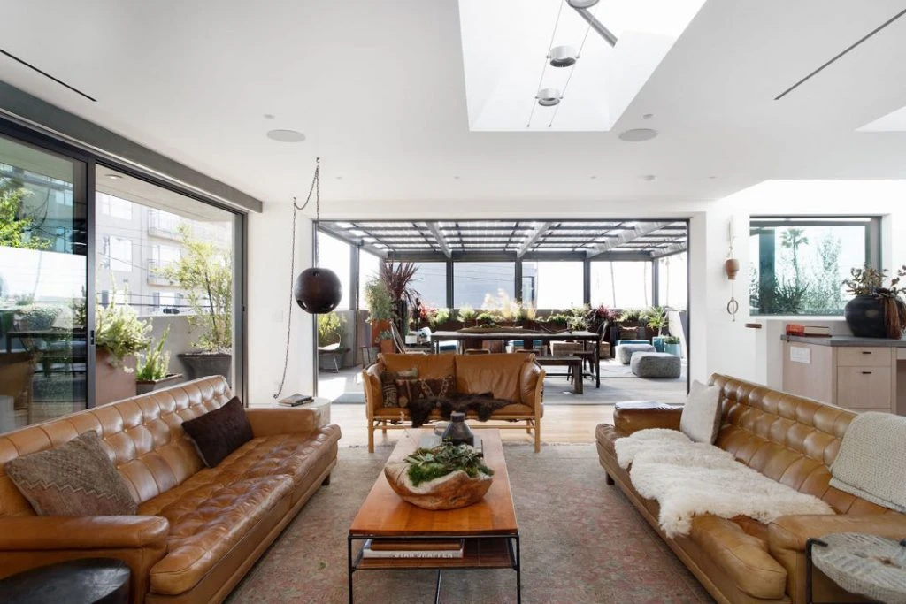 Cuero suela capitoné para los sofás del living, mesas de hierro y madera por doquier y en el pasillo junto a la escalera, unos sillones que pertenecieron al célebre anfiteatro de Los Angeles: una joyita que Anna atesora especialmente.