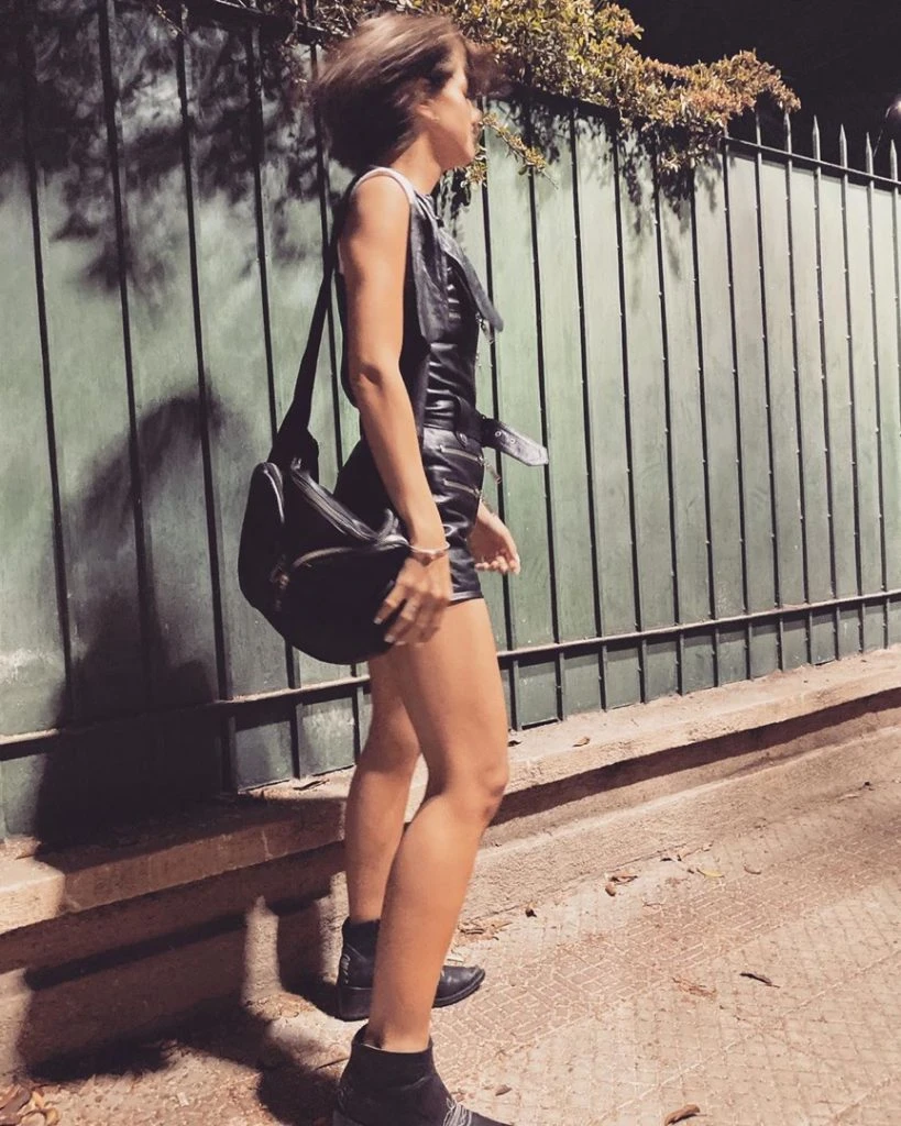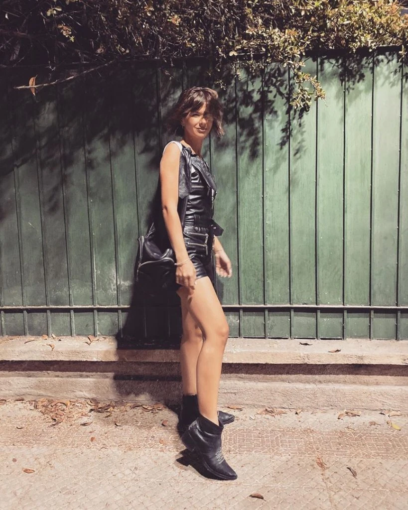 Y casualmente desde allá posteó fotos lookeadas con un estilo muy rockero. Llevó un mono de cuero con cinturón y detalles cierres, muy canchero, de la marca Boken. Lo acompañó con remera sin mangas y botitas cortas tipo texanas.