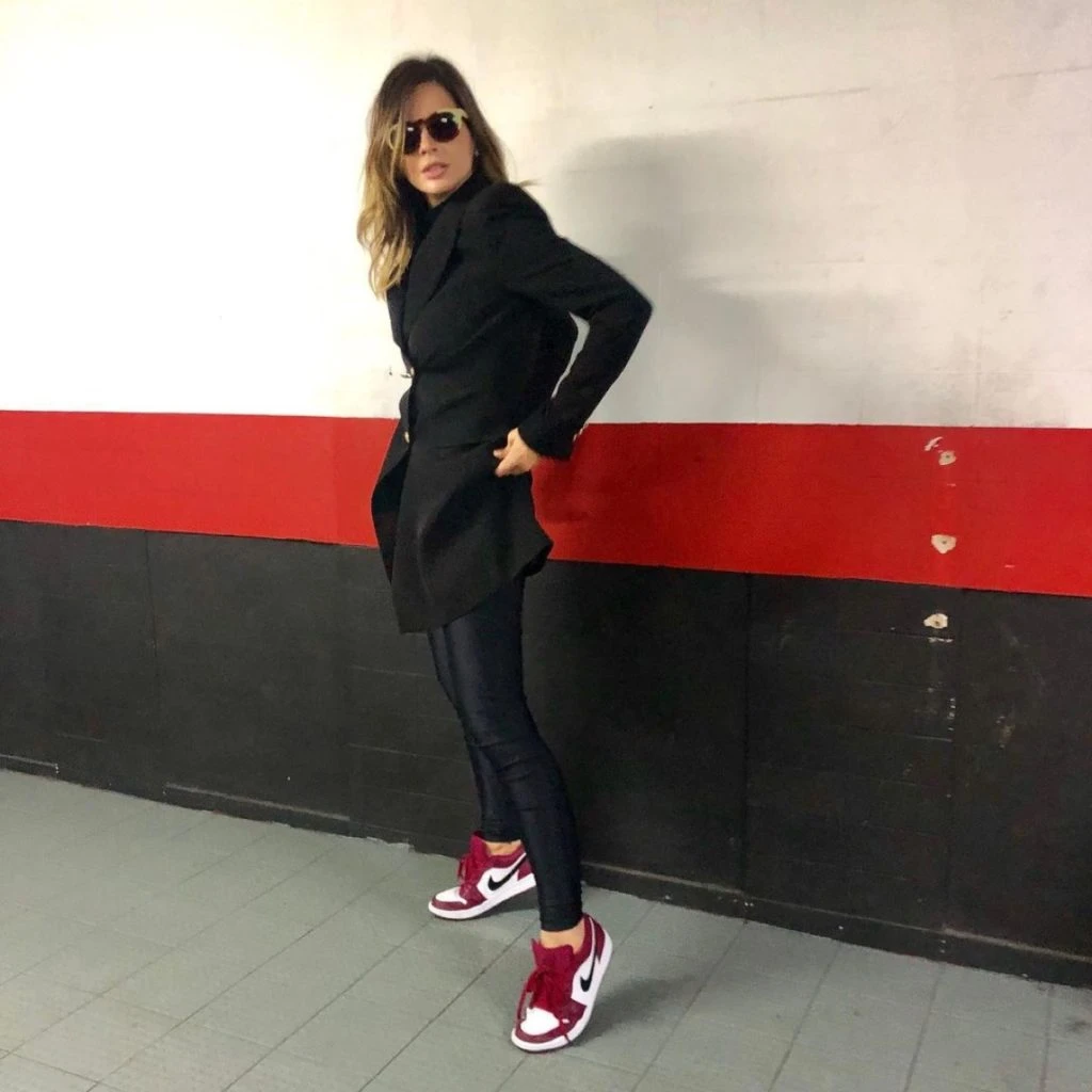 La China Suárez eligió un look total black y el toque de color se lo aportaron las zapatillas.