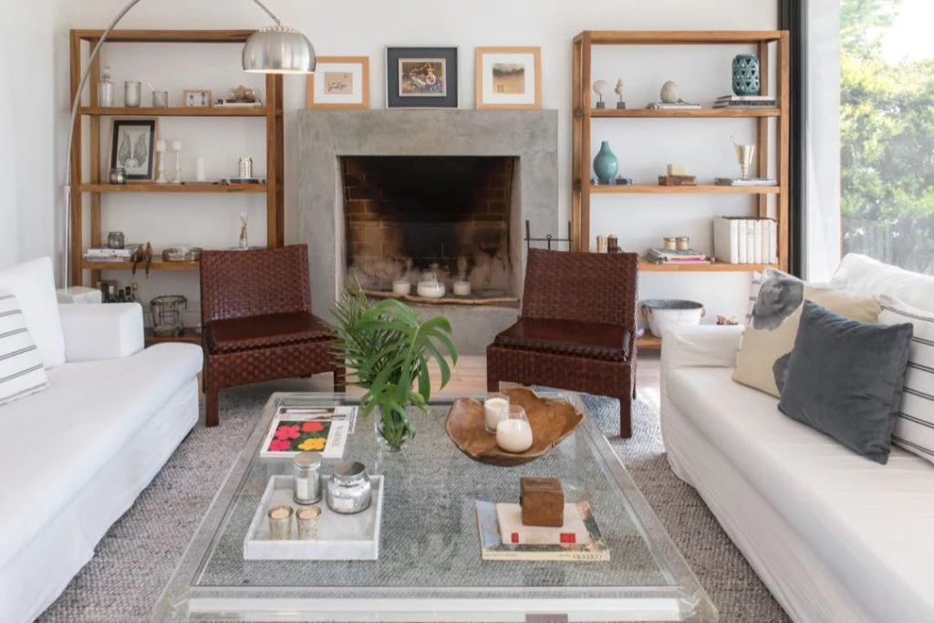 En el living se imponen dos sillones enfrentados de color blanco (@sofa&deco), con almohadones (@perpetuadeco). Entre ellos, una amplia mesa de acrílico transparente con tapa de cristal que contiene bandejas de mármol y de corteza (@perpetuadeco) con velas, igual que dentro de la chimenea (@llum.velas).