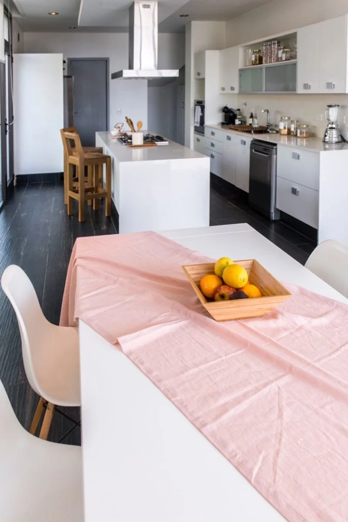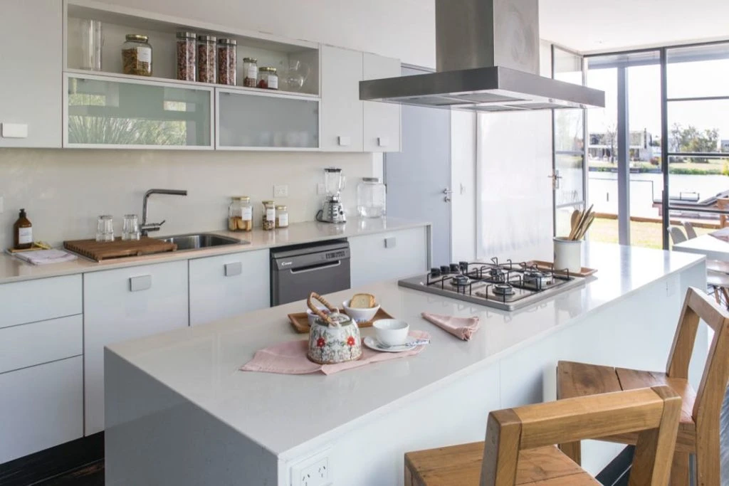 La cocina es amplia y luminosa, con pisos de porcelanato oscuro símil madera (ilva). Tiene salida al jardín. Alrededor de la isla con mesada de Silestone color blanco, unas banquetas hechas en Petiribi macizo y mesa de comedor diario, laqueada en blanco, acompañada con sillas Eames.