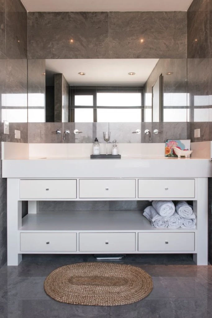 El baño de esta suite tiene una tina con vista hacia la laguna y un mueble para la bacha en madera blanco laqueado. Un gran espejo refleja el paisaje y en el ambiente se destacan algunos complementos deco y funcionales, como alfombras de yute, escurridor de ducha y envases reutilizables de @co_casaorganizada.