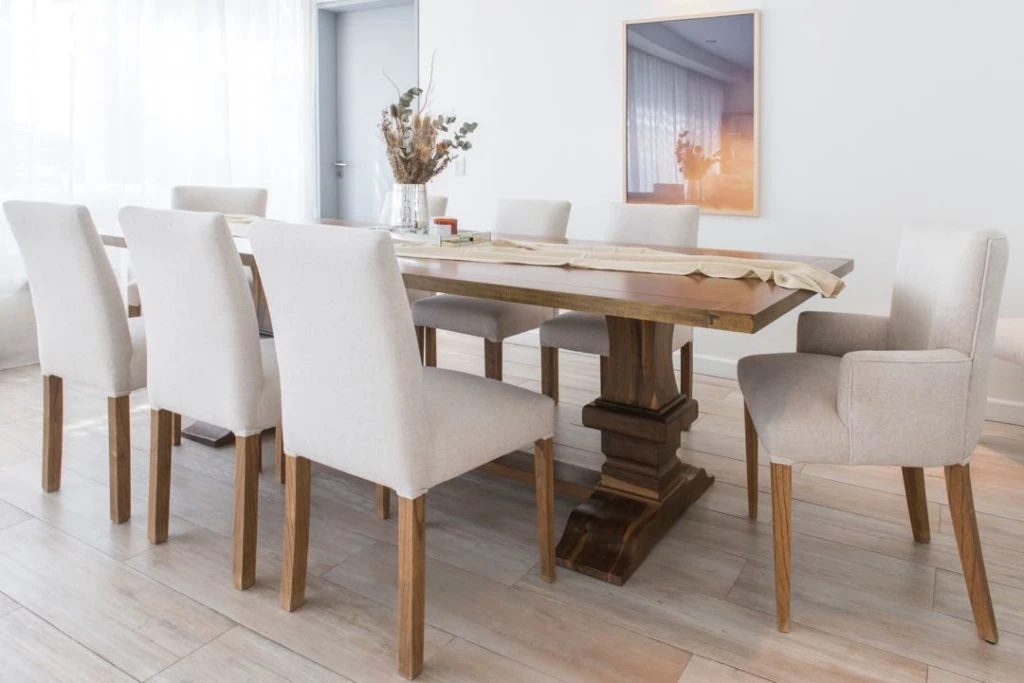 Hacia la derecha de esta mesa de centro, se pasa al comedor, con una gran mesa de madera lustrada en Petiribi, con ocho sillas tapizadas en color crudo, más una foto enmarcada de la artista Pilar Odriozola.