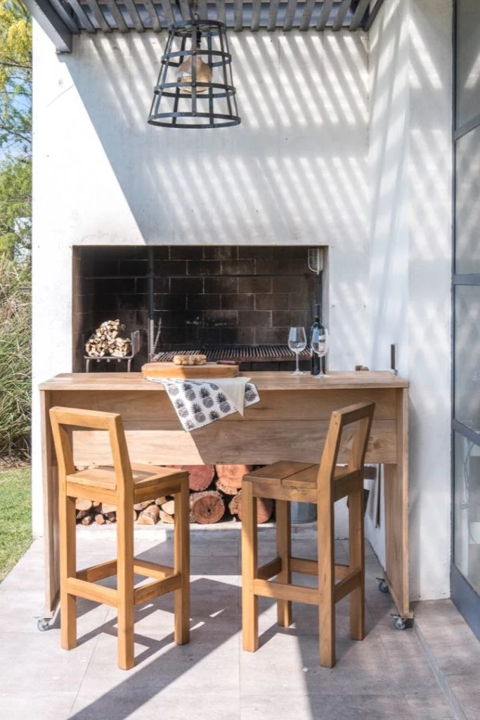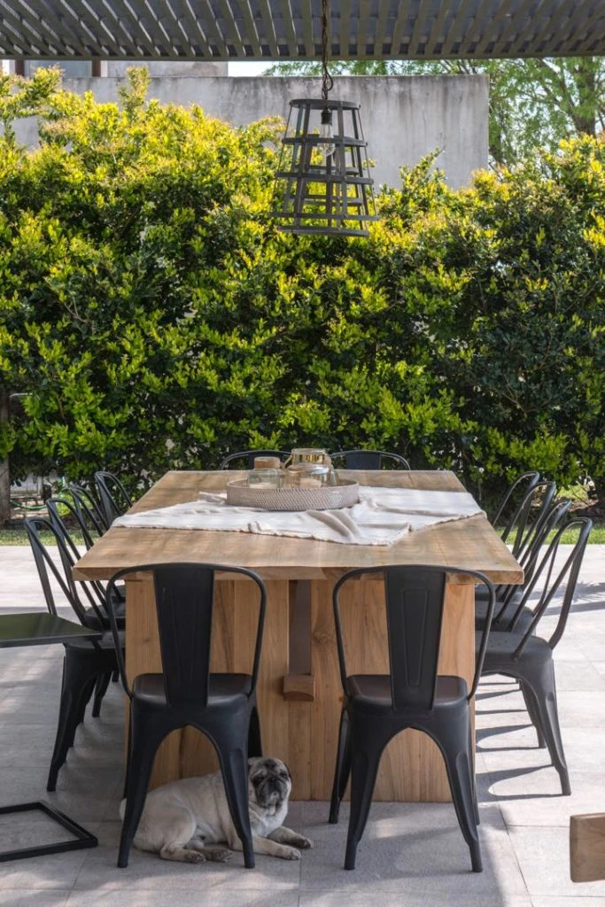 En el deck de la pileta, dos reposeras rústicas de madera Guatambú con colchonetas negras y una mesa de arrime de hierro negro. Y en el jardín, a orillas de la laguna, un gran fogonero con dos bancos con tapa de asiento en madera orgánica: uno hecho en madera Petiribi y el otro en hierro y madera Paraíso.